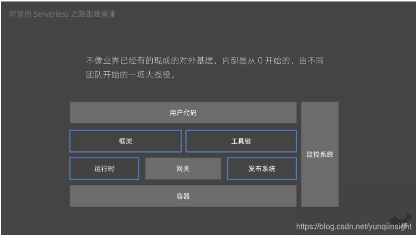 但是阿里的 Serverless 之路非常困难,不像外界已经有成熟的体系,目前一些原因无法使用公有云上开放的产品,阿里云也无法直接对内部提供服务,同时,内部的中间件在外部都没有,都需要跨团队来重新建设。
