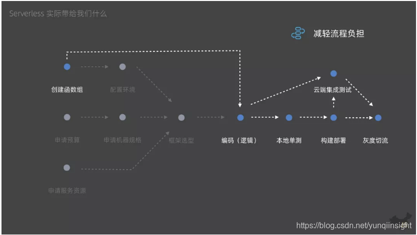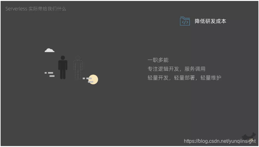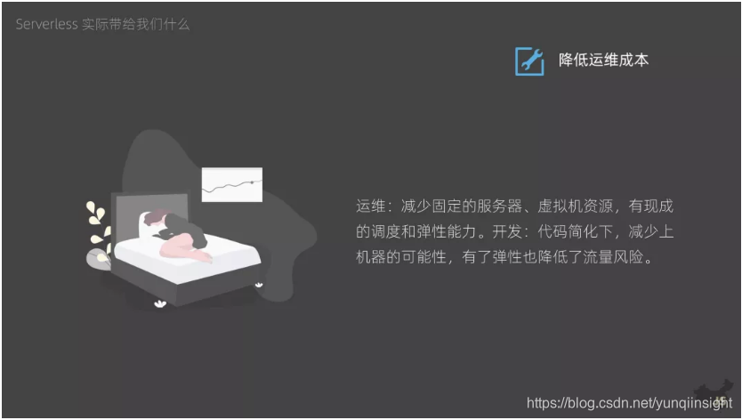 现在都说 DevOPS,而 Serverless 最大的好处是减少运维,减少固定服务器资源,不需要用户关心调度等,同时也简化了开发的代码,专注了逻辑,晚上睡觉会更加的放心,不再担心机器容量不足而报警。