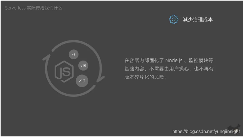 另一边,对于我们应用治理的人来说,之前会考虑各种版本碎片化的问题,node 的多版本,框架的多版本,以及启动脚本、依赖等等问题,而使用 Serverless