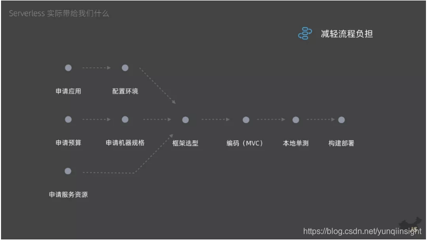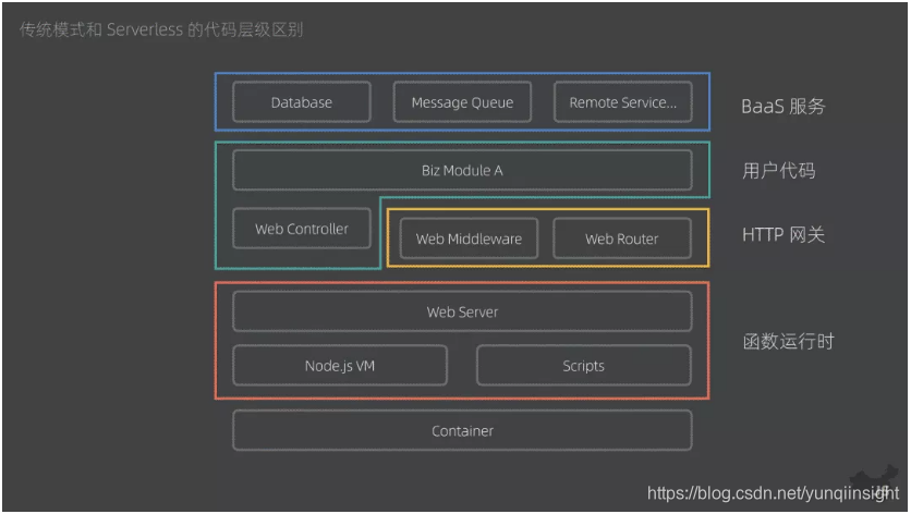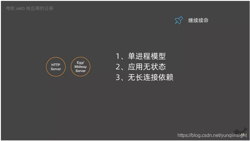 这种方式需要调整的是,框架需要使用单进程模型(机器配置,轻量化的要求),应用需要无状态(函数机制决定),以及没有长连接等高消耗的操作。