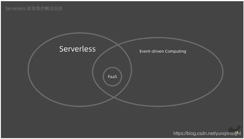 在概念上,Serverless 比 FaaS 的外延要广,FaaS 属于 Serverless 的其中一种实现方式,主要解决的是用户自定义的代码逻辑如何做到 Serverless,也可以叫做 Serverless Compute,同时它也是事件驱动架构的一种。