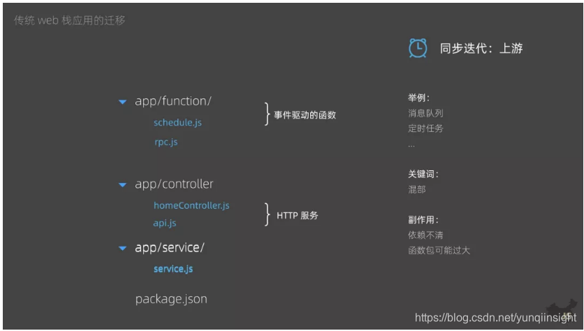 把整个应用迁移到函数会有一些限制,会对代码结构和模型做一些微调,以符合整个 Serverless 的结构,毕竟新的体系和传统的代码模型是有所区别的。