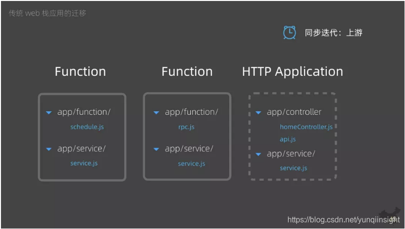 - HTTP 服务,原框架(koa/midway/egg…),Node.js 运行时,启动脚本等,将会变为函数运行时,固化下来