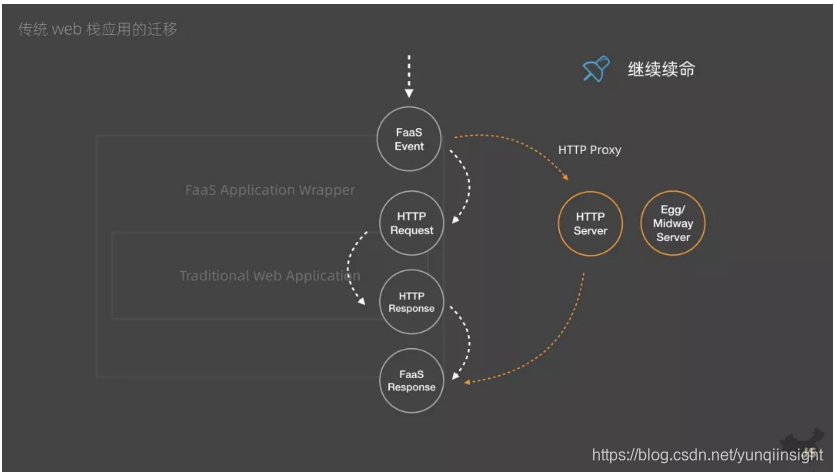 我们把原有的 Web Server(midway/egg),启动起来,在运行时中通过一个固定的端口转发,把 FaaS 的请求参数包裹成 HTTP Request 对象,而在出口处,也将 HTTP Response 包裹为函数能读懂的形式,通过这样续命的方式来延续传统应用。而由于阿里云上的容器只读不能写,目前还无法直接用这种模式。
