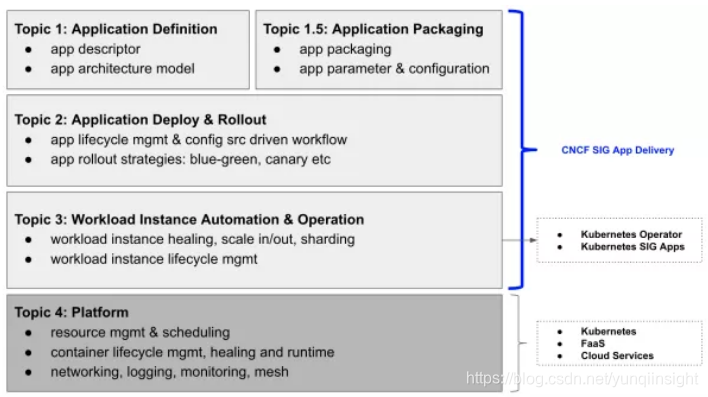 另一方面,复杂应用的支持不止编写 Operator 这么简单,这里还需要有状态应用交付的技术支撑,这是目前社区上各种持续交付项目都有意或者无意间忽略掉的事情。事实上,持续交付一个基于 Operator 的有状态应用,跟交付一个无状态的 K8s Deployment 的技术挑战完全不是一个量级的。这也是孙健波所在团队在 CNCF 应用交付领域小组(CNCF SIG App Deliver)倡导“应用交付分层模型”的重要原因:如下图所示,四层模型分别为“应用定义”、“应用交付”、“应用运维与自动化”、“平台层”,只有通过这四个层不同能力的合力协作,才能真正做到高质量和高效率的交付有状态应用。