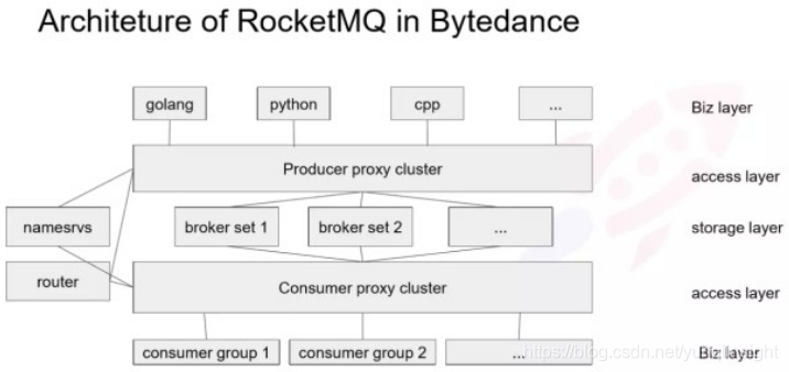 今日头条的服务大量使用微服务,容器数目巨大,业务线繁多, Topic 的数量也非常多。另外,使用的语言比较繁杂,包括 Python,Go, C++, Java, JS 等,对于基础组件的接入,维护 SDK 的成本很高。