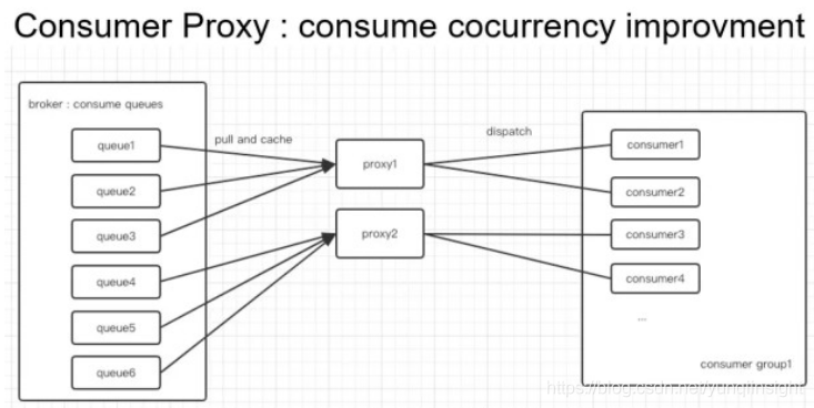 4,通过 Proxy ,多了一个代理,在消费不需要顺序的情况下,我们可以支持更高的并发度, Consumer 的实例数可以超过 Consume Queue 的数量。