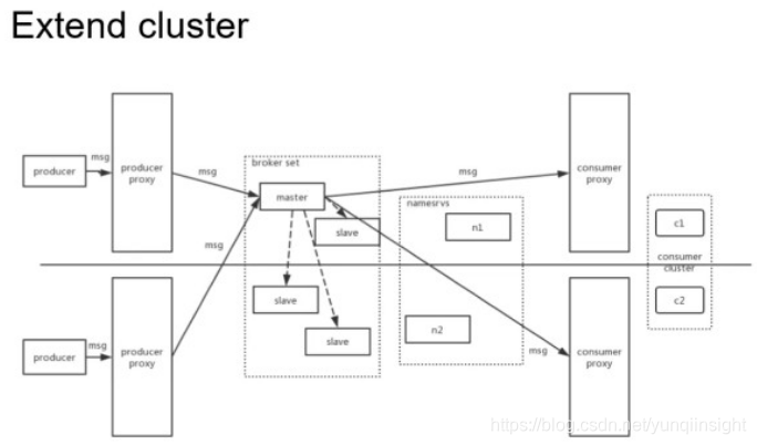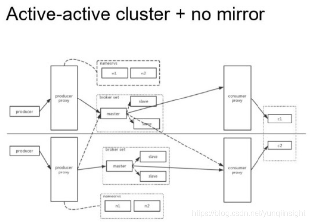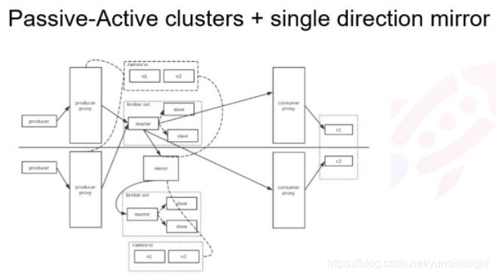 这是 master 和 slave 跨机房去部署的方式。因为我们有一层 proxy ,所以可以很方便的去做流量的调度,让消息只在一个主机房进行消息写入,不需要一个类似中控功能的实体存在。