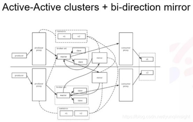 第三种方案:双写加双向复制的架构。这个结构太复杂不好控制,尤其是双向复制,其中消息区回环的问题比较好解决,只需针对在每个正常的业务消息,在 Header 里加一个标志字段就好,另外的 Mirror 发现有这个字段就把这条消息直接丢掉即可。这个链路上维护复杂而且存在数据冗余,其中最大问题是两边的数据不对等,在一边挂掉情况下,对于一些无法接受数据不一致的是有问题的。
