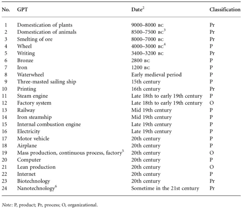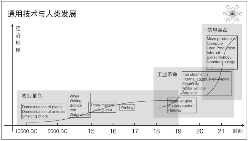 从新石器时代农业革命,对动植物的驯化技术、文字书写技术,到18-19世纪第一次工业革命,蒸汽引擎技术、工厂系统、铁路系统……,到第二次工业革命,内燃机技术、电力技术、汽车技术、飞机技术……,再到20世纪信息革命,计算机、互联网、生物科技等。通用技术的发明间隔时间越来越短、密集程度越来越高、影响范围也越来越大、生产力的提升也越来越快。