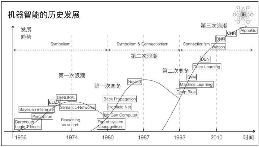 1955年冯·诺伊曼接受了耶鲁大学西里曼讲座的邀请,讲稿内容后来汇总成书《THECOMPUTER AND THE BRAIN》。1956年,约翰·麦卡锡在达茅斯学院夏季学术研讨会上首次提出了「Aritificial Intelligene」的概念。至此,机器智能的历史序幕正式拉开,符号主义(Symbolism)、联结主义(Connectionism)、行为主义(Actionism)三大流派相继形成。