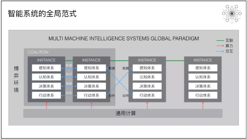 单个智能实例都是由「感知-认知-决策-行动」的体系构成的自主系统,有着自己的世界表征形式,能自主完成自身的目标任务。在同一个动态复杂的博弈环境之中,实例与实例之间通过互联实现在线,彼此存在相互作用,可以合作、竞争,可以竞合并存,也可以既不合作也不竞争。一个实例的策略变化不光会影响自身的环境,也会影响其他实例的策略变化。