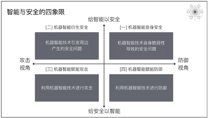 任何一门通用技术,与安全的结合都有如下四种方式。机器智能技术也不例外,纵向是「给智能以安全」和「给安全以智能」,横向是「攻击视角」和「防御视角」。给智能以安全,是指机器智能技术本身会带来新的安全问题,一种是机器智能自身脆弱性导致的安全问题,一种是机器智能引发周边场景衍生出的安全问题。给安全以智能,是指将机器智能应用于安全场景,攻击者利用机器智能赋能攻击,防御者利用机器智能赋能防御。