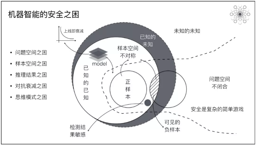 安全的问题空间通常都是无界的,同时问题空间对应的正负样本的样本空间却又严重的不对称。「未知的未知」引起的负向数据(如攻击数据、风险数据等)的严重缺乏导致特征空间的不对称,进而导致特征空间无法真正表征问题空间。「模型」是已有数据空间下关于世界的假设,并且用于在新的数据空间下进行推理。今天机器智能技术已经能很好的解决表示输入和输出之间的非线性复杂关系,但对于样本空间与问题空间存在的巨大鸿沟却依然比较乏力。