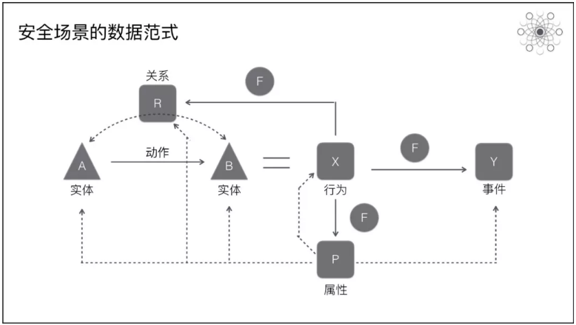 而安全场景下的通用数据范式,也离不开Ontology。实体、属性、行为、事件、关系,通过这五大元数据类型,可以构建出所有安全场景中的数据架构(无论是基础安全、业务安全、数据安全、公共安全、城市安全……注:公共安全领域也单独关注「轨迹」这一类元数据类型,因「轨迹」是一种特殊的「行为」数据,故这里统一都合并成行为)。