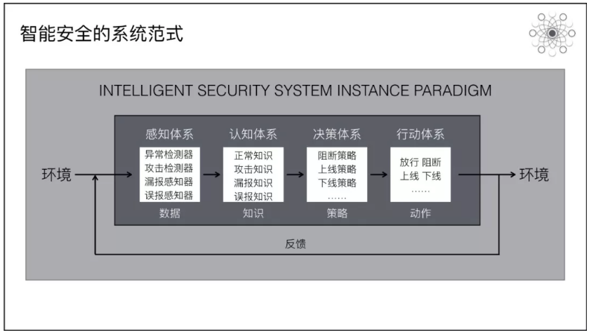 真正意义上的智能安全系统一定也是具备感知体系、认知体系、决策体系和行动体系,同时和环境形成反馈闭环。感知体系至少包括异常感知器、攻击感知器、漏报感知器和误报感知器。「异常感知器」的作用一方面是保持感知「未知的未知」的能力,另一方面是利用「通过定义正常来寻找异常」的思想来解「样本空间之困」的问题。「攻击感知器」的作用是在异常数据的基础上去检测攻击,为了解「推理结果之困」的同时,也大大缩减推理结果误报漏报范围。「漏报感知器」和「误报感知器」是为了去解「对抗衰减之困」。由此可以看出,整个行业内大家最常关注的「用算法做攻击检测」,其实只是做了智能系统当中感知体系里很小的一小步。