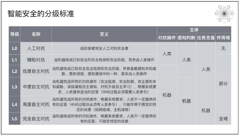 安全领域发展至今,一直处于问题消灭得少概念却造得不少的阶段,亟待利用新技术去真正解决旧问题。机器智能在各个行业的炙手可热,同样也引起了安全行业的追捧。但今天安全领域的智能能力参差不一的同时,又难以分辨其真假。以至于但凡用了一丁点算法的,都会宣称「基于人工智能的XX安全系统」。同早年的智能驾驶领域一样,今天的智能安全也亟需统一的分级标准,用以明确不同级别智能安全技术之间的差异性。「安全的本质是智能体的对抗」,故根据自主对抗的程度,我们将智能安全划分为L0~5共如下6个级别: