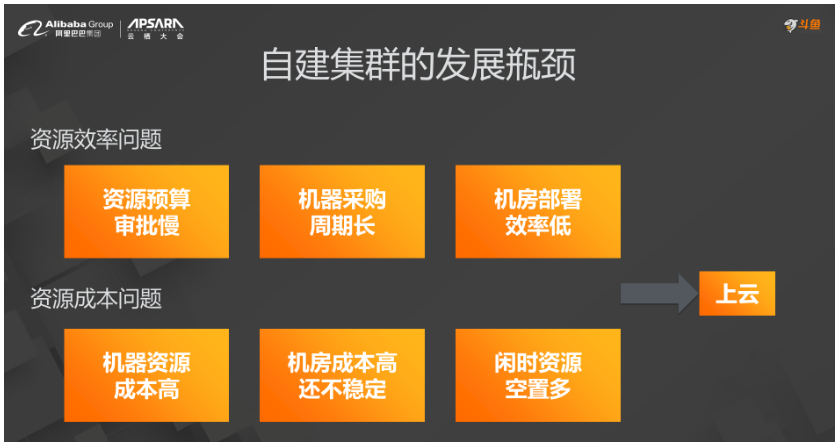 自建集群遇到了发展瓶颈,涉及到资源效率问题和资源成本问题。资源效率问题包括资源预算审批慢、机器采购周期长以及机房部署效率低。资源成本问题包括机器资源成本高、机房成本高还不稳定以及闲时资源空置较多。
