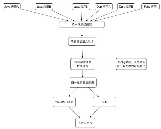 闲鱼的系统架构,入口应用多,而且还有是异构的(有java应用,dart应用,Fass应用)。我们做了一个拦截器,屏蔽这些应用的细节,作统一的拦截处理。 经过统一请求拦截层,将所有的请求日志写入到SLS中。如图