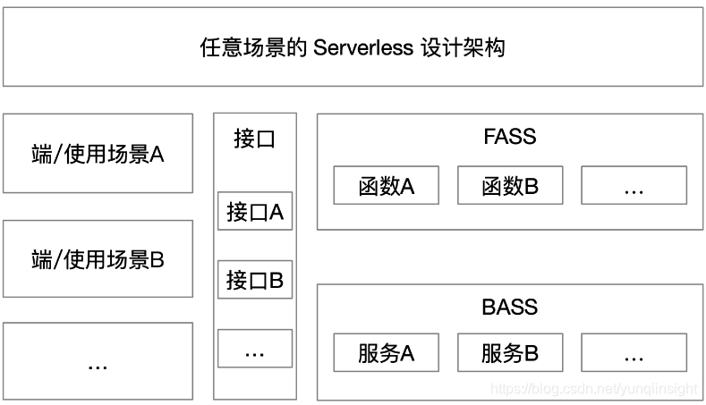 后端及服务,就是集成了许多中间件技术,可以无视环境调用服务,比如数据即服务(数据库服务),缓存服务等。虽然下面还有很多 XAAS,但组成 Serverless 概念的只有 FaaS + BaaS。