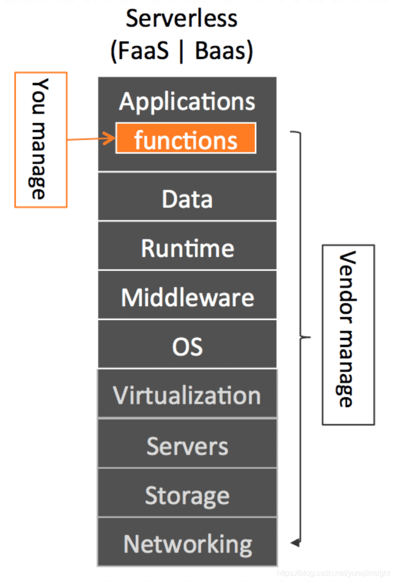 网络、存储、服务、虚拟家、操作系统、中间件、运行时、数据都不需要关心了,甚至连应用层都只需要关心其中函数部分,而不需要关心其他比如启动、销毁部分。
