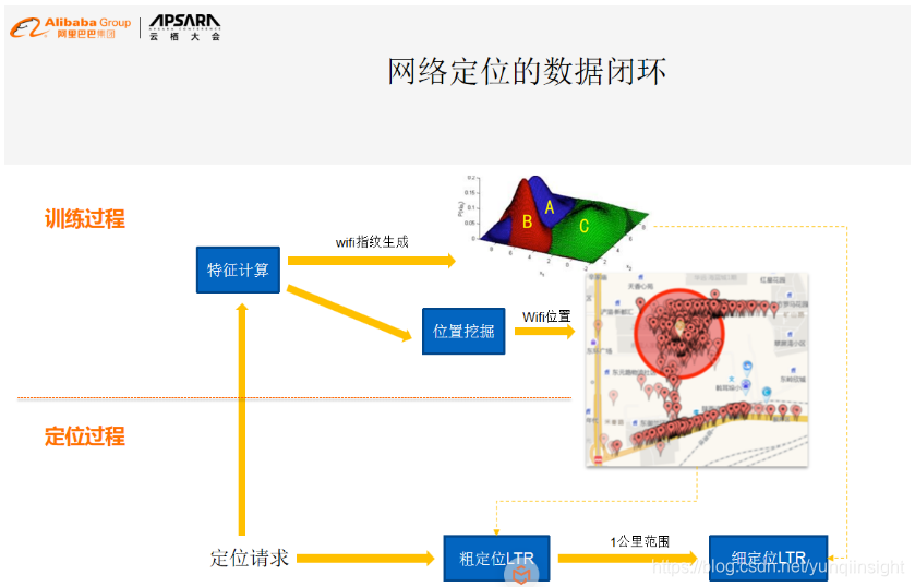 网络定位本质上是一个数据闭环,每个人在定位的时候,实际上是发送了本身的基站和Wifi列表,发送的数据一方面可以用来定位,另一方面也可以用做数据训练。数据训练主要产出两种数据,一个是Wifi基站的位置,通过数据挖掘,我们就可以获得大概的位置(初始定位),但是精度比较差。第二个是产生更详细的空间信号强度分布图。有了这个图以后,就可以进行比较精准的定位了,根据信号强度判断我距离这个基站和Wifi有多远,从而对精度进行改进。