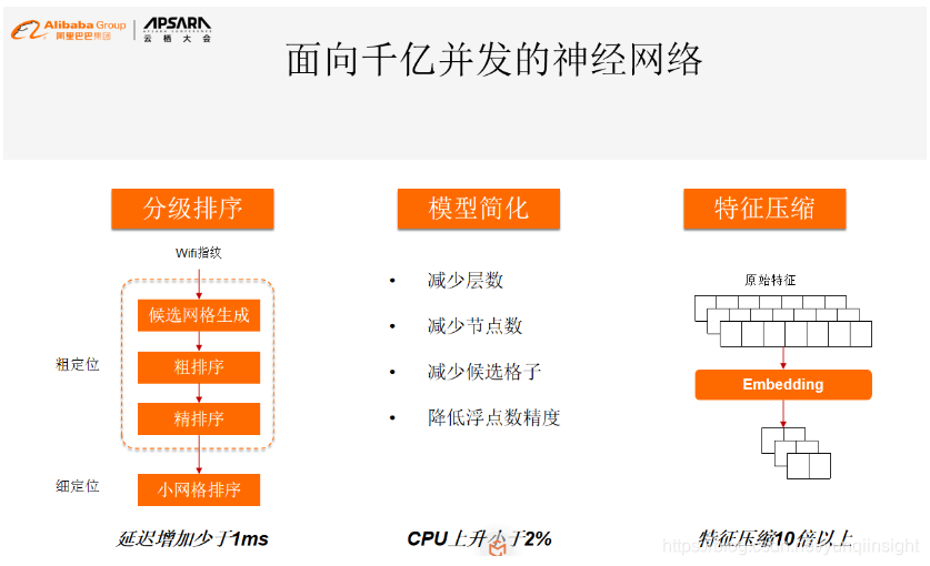 第二是模型简化。虽然深度学习的效果很好,但是不可能在线上用很复杂的模型,我们通过减少层数和节点数,把浮点数精度降低。