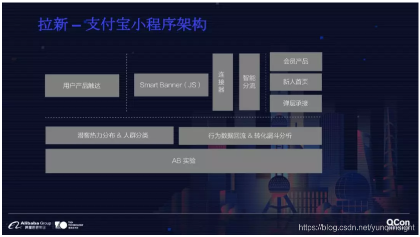 最前面是用户产品的触达方式。横向拉通是 Smart Banner ,通过以前的信息和端智能的场景,对用户进行分流,判断用户是新人还是以前来过,根据相关兴趣去提高转换。后台主要分三部分,第一是在拉新场景里,潜客的热力分布,判断用户喜欢在什么地方出现,喜欢干什么样的事,并对其进行人群分类;第二是对不同承接页的效果数据进行回流,通过迭代优化漏斗分析;第三是 AB 实验,反复打磨产品和承接效率。
