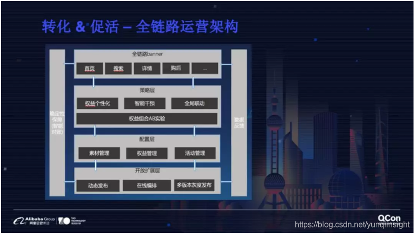 如下图所示,全链路下层是成体系的系统结构,上面是策略层,主要是权益的个性化,后面主要是对可复用、科扩展的支持,可以快速运用到很多不同的场景。目前淘系主要用的是全链路激励。举个例子,在淘系,不同的用户,我们可以智能化透出几十个不同的 Banner 引导用户。