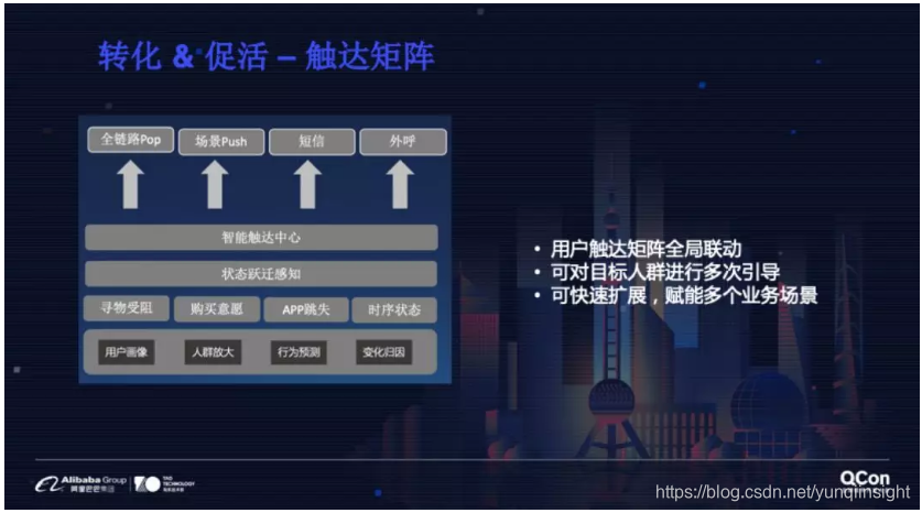 另外就是触达矩阵,如下图所示。对用户进行比较有效的引导要通过短时间内的多次触达,因此淘系做了全局联动的触达矩阵。在用户动线的每一个节点上设置触点,这些触点的目标不是驱动用户走向漏斗的下一个节点,而是由用户生命周期干预系统统一控制,驱动用户在生命周期之间跃迁。并通过算法提供的基础能力进行智能触达,具备了对目标人群进行多次引导的方法,通过可扩展性的延伸可以快速拓展,支持多个业务的场景。