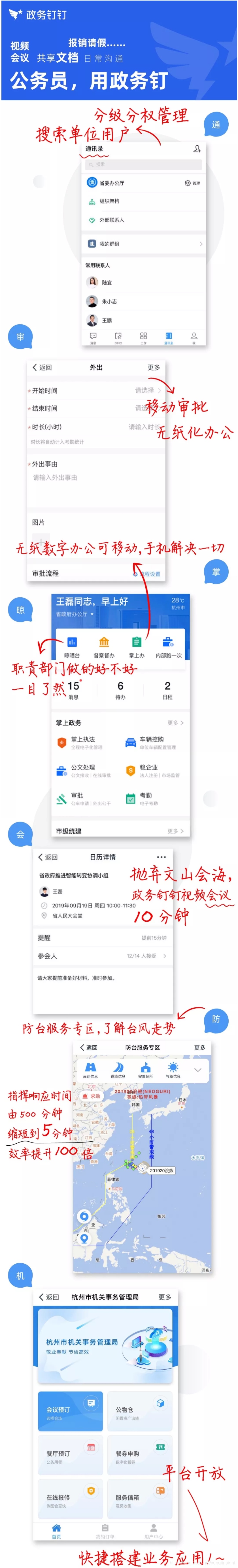 今天,浙江省政府与阿里巴巴集团合作开发的政务钉钉首次对外亮相。政务钉钉是在线政务协同平台,它的应用软件整合了政务专属通讯录、千人千面的工作台、智能会议、移动办公等诸多功能,从而改变了公务员传统的工作方式。