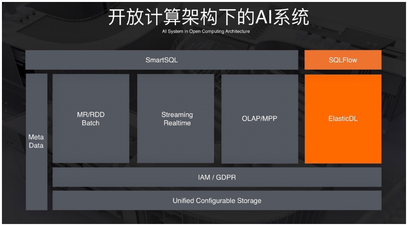 开放架构下可以插入AI引擎,我们在SQL层和深度学习引擎都做了一些工作。SQLFLow相当于用SQL描述你对应用的需求,底层会直接针对SQL产生出机器学习的任务来训练模型。