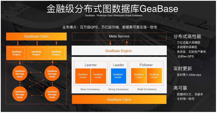 首先第一个是金融级分布式图数据库GeaBase,解决的问题是,当你有海量的图数据,数据之间有关系的时候,提供强一致、高容量的存储。它和现有的一些图数据库最大的区别是,很多现有的图数据库都是把所有数据收起来做一个计算,这是最简单的做法,但会导致性能瓶颈,我们做的是把计算下发到worker以实现分布式的高性能。同时GeaBase可以根据用户的业务需求去选择需要什么样的一致性。