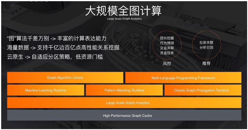 然后是大规模全图计算,采用了自适应的分区策略来降低资源门槛,因为很多图计算里面都是需要把全图加载到内存里面,然后进行迭代,这种情况一些超大图对内存的需求量非常高,所以我们做了一些优化希望降低资源的使用率。同时我们也能够更灵活的支持更多的图算法,以及能够做非常大规模高效图关系的挖掘,这个也已经在内部的风控场景落地。