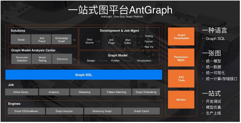 当有了这么多系统后,我们遇到的问题是,在一个场景下需要针对多个引擎做研发,所以我们开发了一站式平台AntGraph,为从开发调试到生产上线整个流程提供便利。我们把所有的访问统一到一个Graph SQL下面,关于这个我们也在进行一些额外的探索,因为到底SQL是不是最适合于Graph语言是有争议的,但我们可以用SQL部分描述性的功能再加上一些扩展,可以完成我们想要的功能。