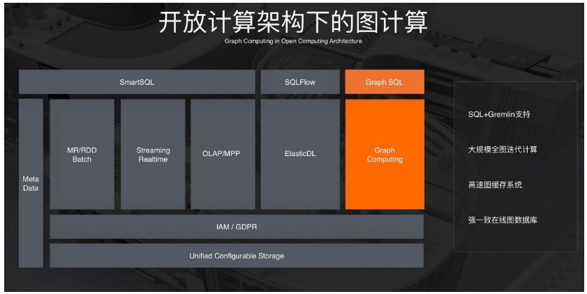 经过前面针对图计算能力的研发后,我们拥有多个图计算引擎,同时为了优化客户体验,在上层也用SQL语言进行统一。这样我们的开放计算架构就拥有了强大的图计算能力。