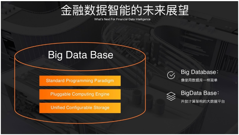 另外一个层面,Big Data Base还意味着可以在一个体系中很方便的使用包含机器学习、图计算以及未来各种各样的计算引擎。这套开放计算架构中的很多组件我们已经开源,这个大的体系我们还在研发过程中,未来会和大家分享更多的细节,希望大家能够一起参与进来,把金融的数据智能领域推到下一个阶段。