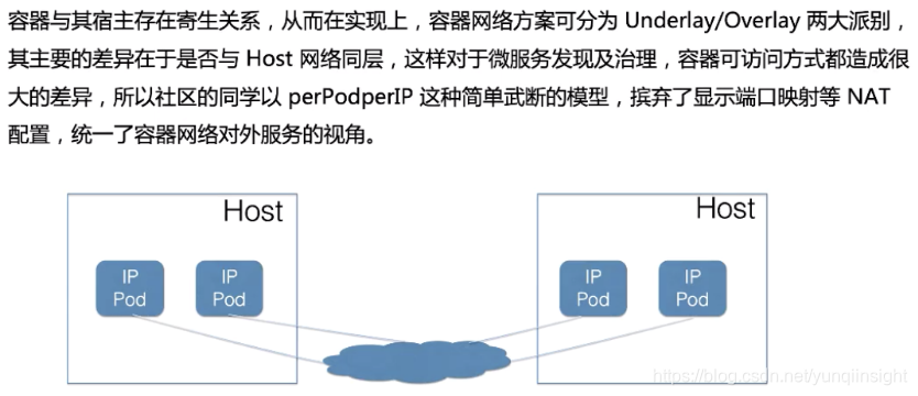对基本约束,可以做出这样一些解读:因为容器的网络发展复杂性就在于它其实是寄生在 Host 网络之上的。从这个角度讲,可以把容器网络方案大体分为 Underlay/Overlay 两大派别: