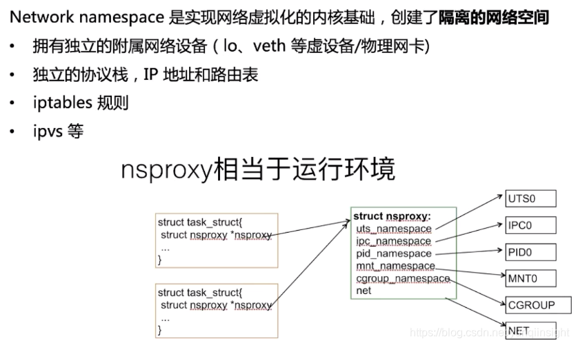 下面简单讲一下,Network Namespace 里面能网络实现的内核基础。狭义上来说 runC 容器技术是不依赖于任何硬件的,它的执行基础就是它的内核里面,进程的内核代表就是 task,它如果不需要隔离,那么用的是主机的空间( namespace),并不需要特别设置的空间隔离数据结构( nsproxy-namespace proxy)。