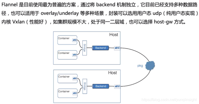 Flannel 方案是目前使用最为普遍的。如上图所示,可以看到一个典型的容器网方案。它首先要解决的是 container 的包如何到达 Host,这里采用的是加一个 Bridge 的方式。它的 backend 其实是独立的,也就是说这个包如何离开 Host,是采用哪种封装方式,还是不需要封装,都是可选择的。