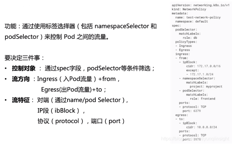 - 最重要的就是第三部分,如果要对选择出来的方向加上控制对象来对它流进行描述,具体哪一些 stream 可以放进来,或者放出去?类比这个流特征的五元组,可以通过一些选择器来决定哪一些可以作为我的远端,这是对象的选择;也可以通过 IPBlock 这种机制来得到对哪些 IP 是可以放行的;最后就是哪些协议或哪些端口。其实流特征综合起来就是一个五元组,会把特定的能够接受的流选择出来 。