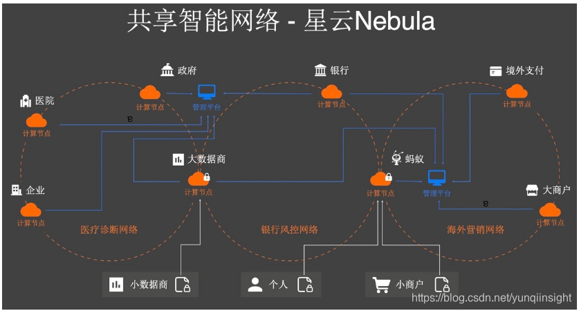 网络中存在各式各样的计算节点,能够在某个管理平台中进行触发实现AI计算。这个共享智能网络,可以用不同的技术完成共享智能的目标,比如,构建联合营销网络,节点之间可任意组网,采用多方安全计算技术来实现联合营销,同时管理节点可以部署在任何的地方;对于某些机构而言,可能没有很强的AI能力和多方计算能力,那他们可以依赖于云这样的技术,将数据放在可信执行环境中,去参与建设这样的网络,通过这样的共享智能技术来解决AI落地最后一公里的难题。