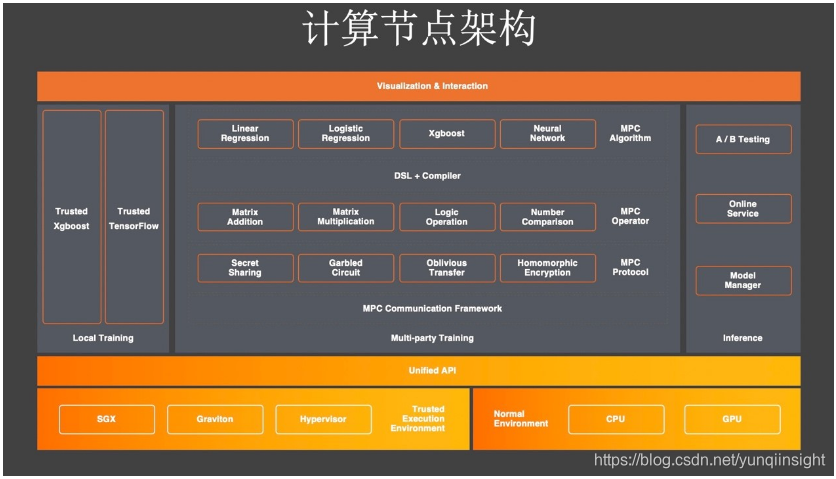 我们整个计算节点的架构如上图,最底层跟正常环境比较相似,左边是各式各样的可信执行环境,右边是正常的CPU、GPU环境。上面会有统一的API层来屏蔽这些不同的细节。