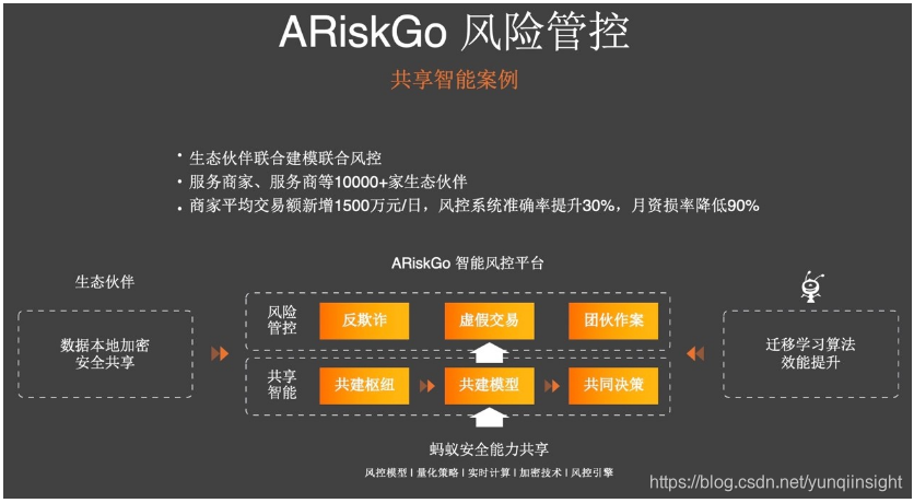 一个是在安全风控领域,联合生态伙伴来建立安全风控网络。生态伙伴使用前面介绍的可信执行环境技术,把数据加密传输到网络中共建这个模型,打击虚假交易、团伙作案等,大幅度提升风控准确率,实现风控网络的净化。通过这样的风控网络平台,使得商家每天新增很多的交易,同时降低资损。
