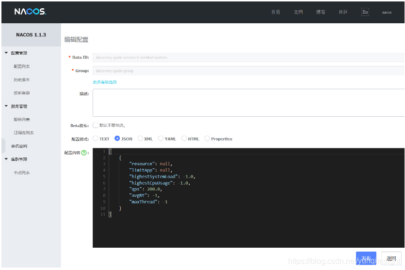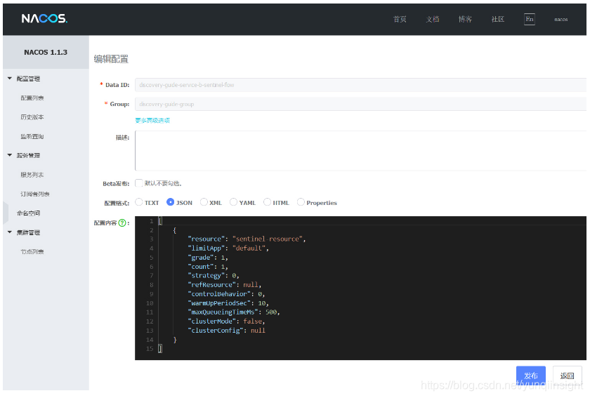 1. Nacos的Key格式:Group为元数据中配置的[组名],Data Id为[服务名]-[规则类型]