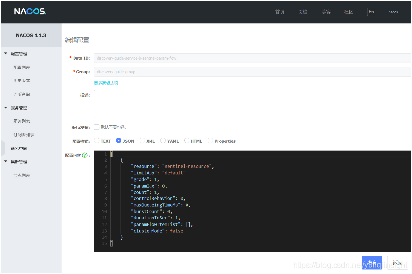 增加服务discovery-guide-service-b的规则,Group为discovery-guide-group,Data Id为discovery-guide-service-b-sentinel-param-flow,规则内容如下: