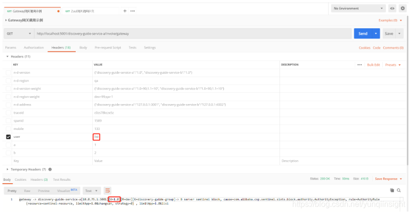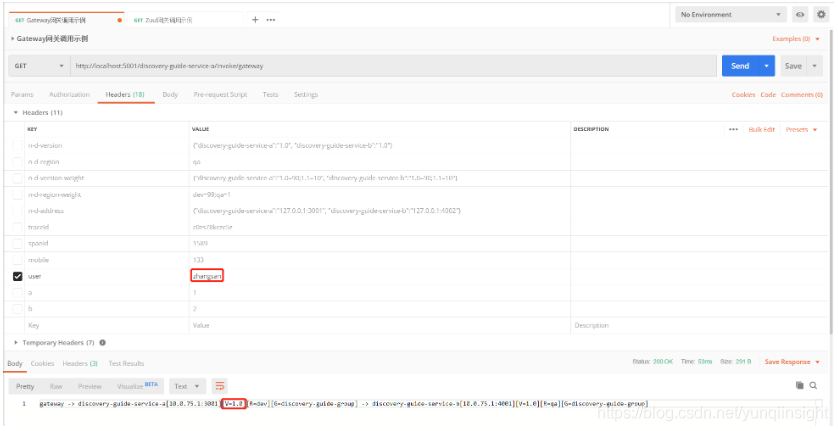 - 当传递的Http Header中user=zhangsan,当全链路调用中,API网关负载均衡discovery-guide-service-a服务到1.0版本后再去调用discovery-guide-service-b服务,最终调用成功