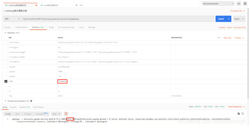 - 当传递的Http Header中user=zhangsan,满足条件之一,当全链路调用中,API网关负载均衡discovery-guide-service-a服务到1.1版本后再去调用discovery-guide-service-b服务,不满足version=1.0的条件,最终调用在discovery-guide-service-b服务端被拒绝掉
