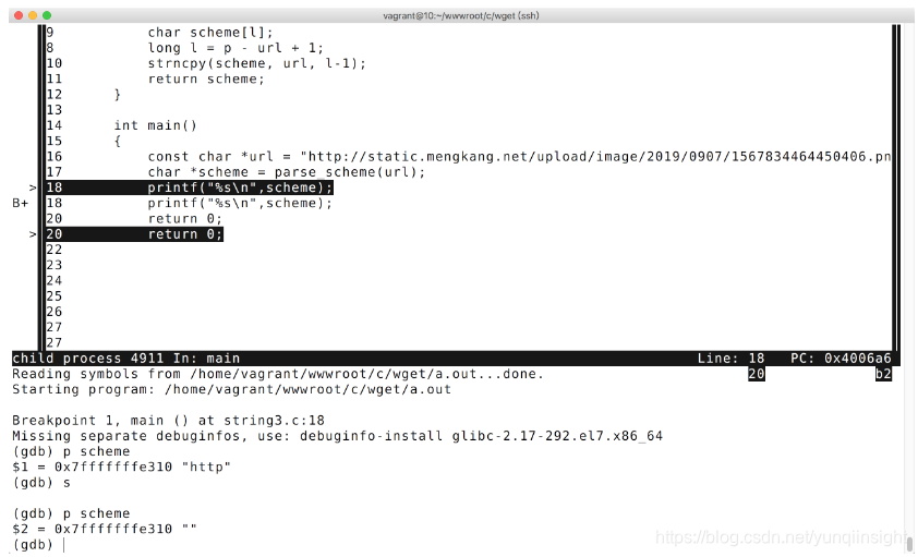 调试信息如下,当从parse_scheme返回时,打印scheme的结果还是http,但是当我们调用printf之后,和上面样例中一样,parse_scheme出栈,printf入栈,则栈上内存就又替换了,所以打印出来的结果则不一定是http了。