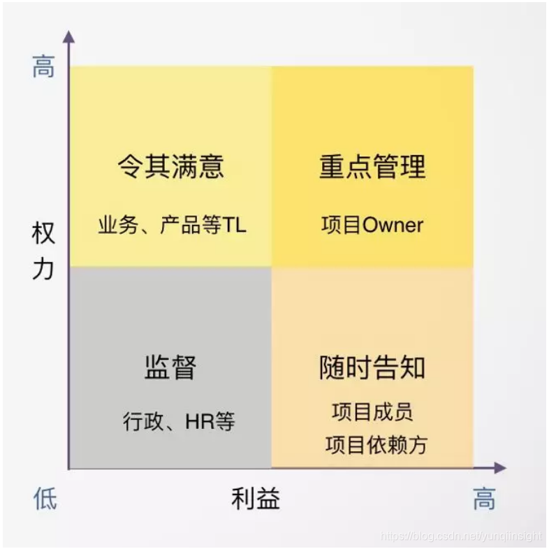 干系人管理过程中,我们可以通过干系人的权力、利益矩阵来针对干系人的优先级进行评估,最终可以根据优先级分为四象限:重点管理、令其满意、随时告知、监督【详见下图】: